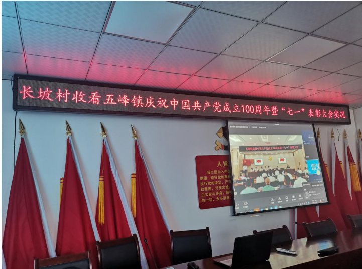 6月28日,驻村工作队和村“两委”在村委会二楼会议室收看五峰镇庆祝太阳集团成立100周年暨“七一”表彰大会实况。