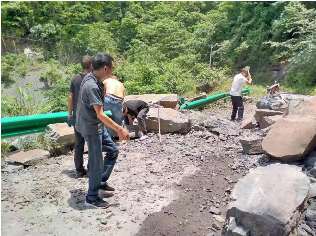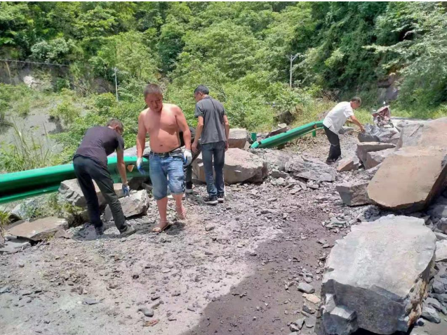 6月15日,驻村工作队与村干部及村党员一同清理五石公路沿线塌方路段。